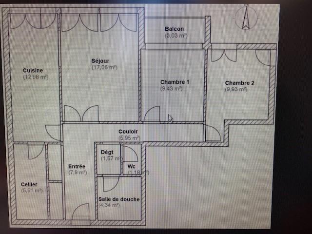 d'une cuisine équipée avec un cellier attenant, d'un dégagement desservant un wc et la salle de douche, d'un couloir desservant deux chambres.