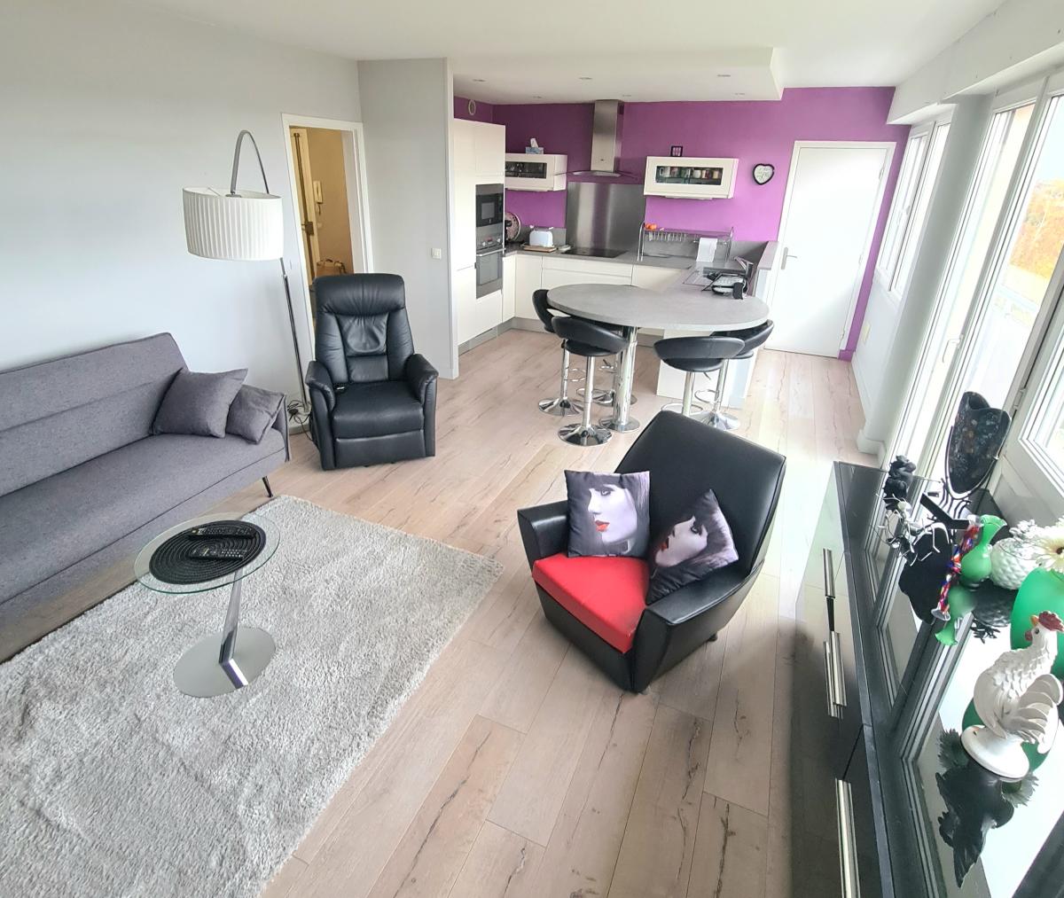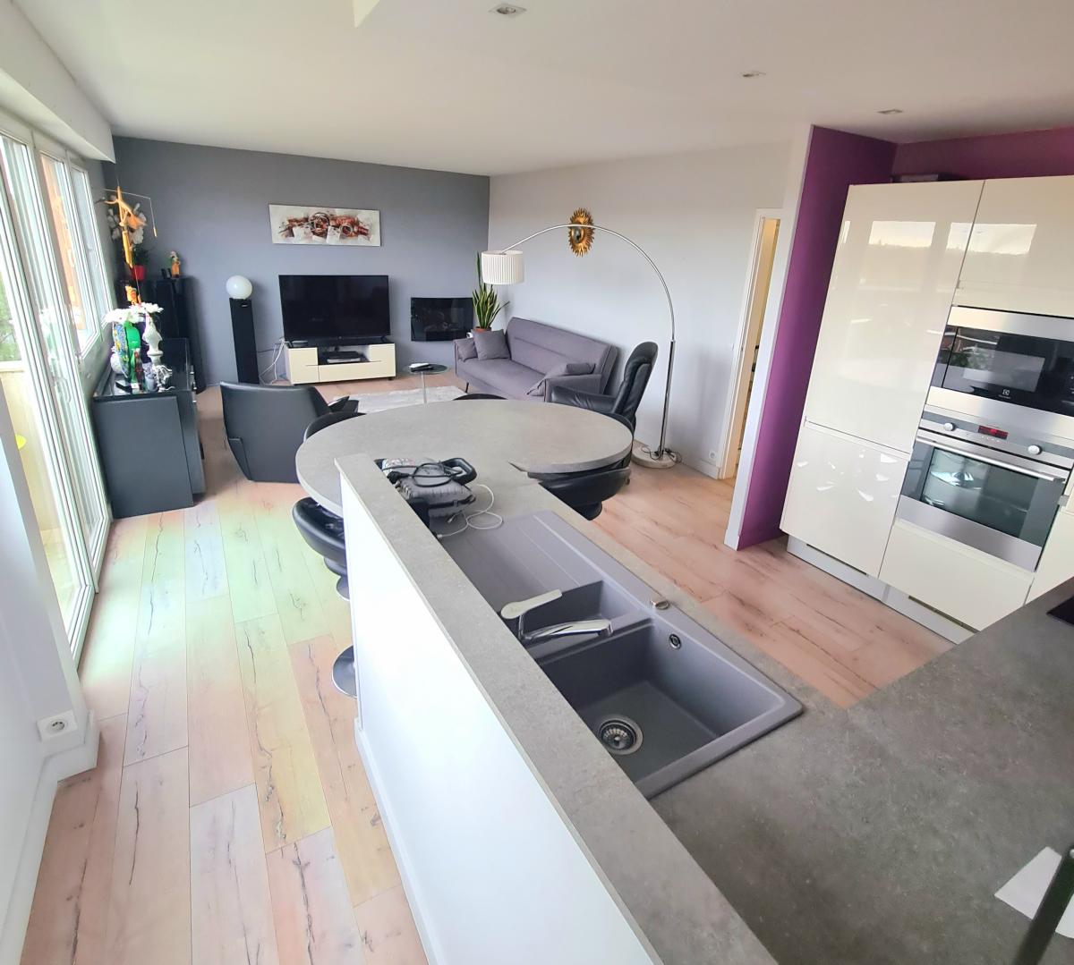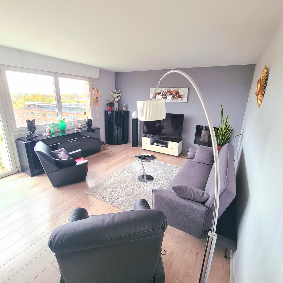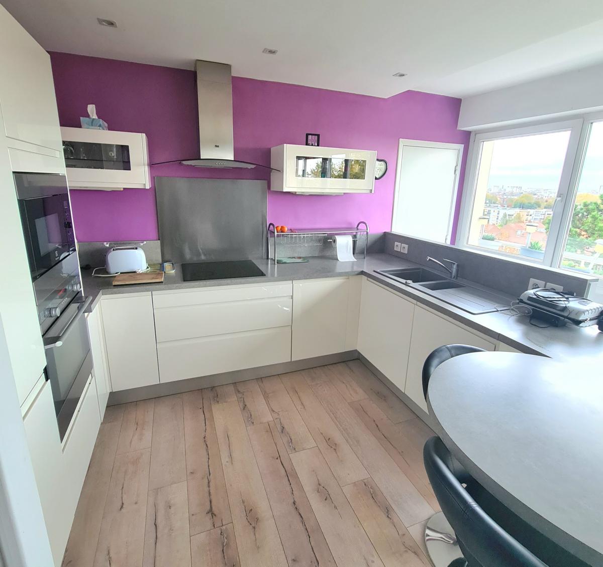 SAINT ANDRE LEZ LILLE quartier Bel Air appartement de Type 4 au dernier étage d'une résidence soignée et entretenue. Il fait 85 m² de surface habitable et dispose d'un balcon bien exposé avec vue dégagée vers Lille et d'un garage. Proche gare de Saint André et Vieux Lille. Il dispose d'une entrée avec placard, un séjour-salon avec une cuisine équipée, un cellier/buanderie, un wc, 3 chambres, une salle de bains et un dégagement avec placards. En plus du garage, vous bénéficiez d'un parking collectif et une cave individuelle. charges : 870€/trimestre (chauffage, eau froide/chaude, ascenseur, syndic, espaces verts, assurances, entretien des communs, portail électrique, vmc). ALUR : 42.30€/trimestre. Toiture de la copropriété changée et ascenseurs aux normes, cheminées rejointoyées. Audit copropriété réalisé avec un classement en D. 120 lots dont 40 logements. TRES LUMINEUX VUE DEGAGEE ET ENVIRONNEMENT CALME.