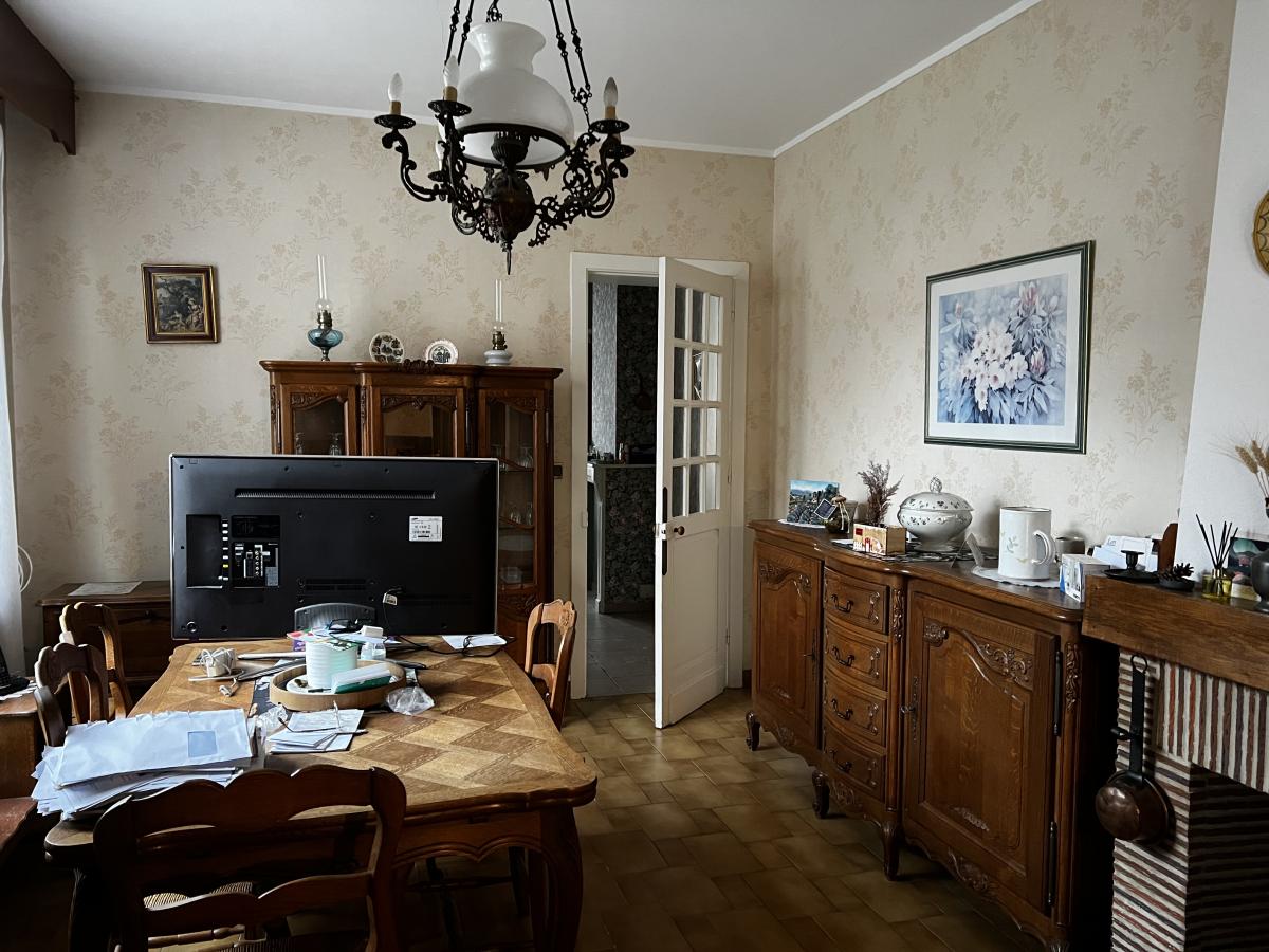au rez-de-chaussée carrelé : salon, salle à manger, cuisine meublée, salle de bains et wc (tout à l'égoût)