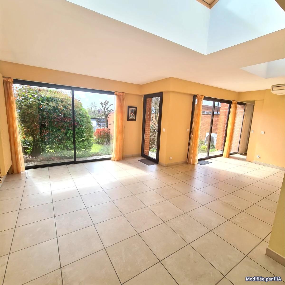 QUESNOY SUR DEULE Maison semi - individuelle de 1974 sur 682 m² de parcelle exposée sud/ouest. Cette maison bien entretenue et lumineuse présente 132 m² de surface habitable. Elle dispose d'un hall d'entrée, un séjour - salon en L avec cheminée feu de bois 53 m², une cuisine équipée, une salle de douche et un wc. A l'étage : 4 chambres dont une avec wc et lavabo et une salle de bains. Un garage avec un espace buanderie de 24m². Un très beau jardin planté de 500m². 2 places de parking. Maison construite avec des matériaux de qualité et très bien entretenue. BEL ENVIRONNEMENT ET PROCHE CENTRE VILLE