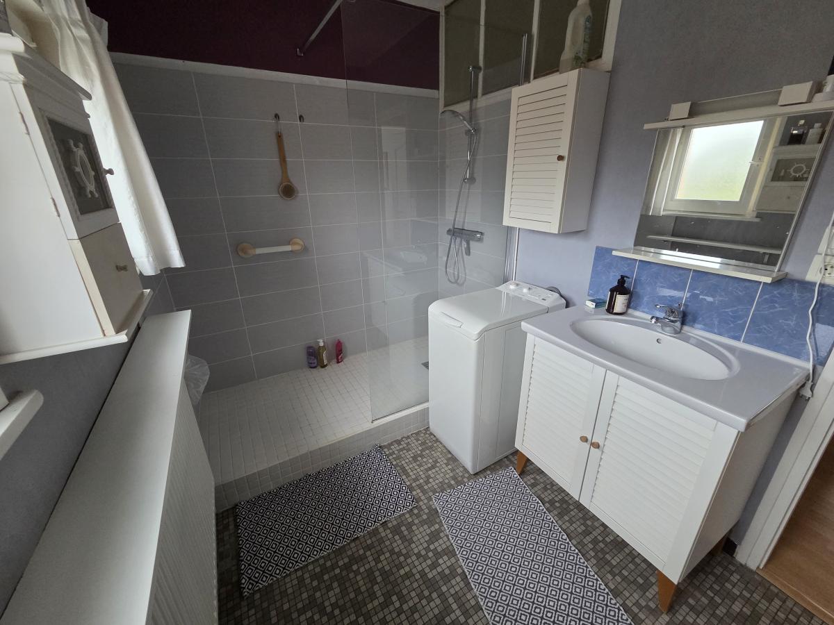 A l'étage, 3 chambres avec parquet flottant, 1 salle de douche actuelle, un grand placard sur le palier.