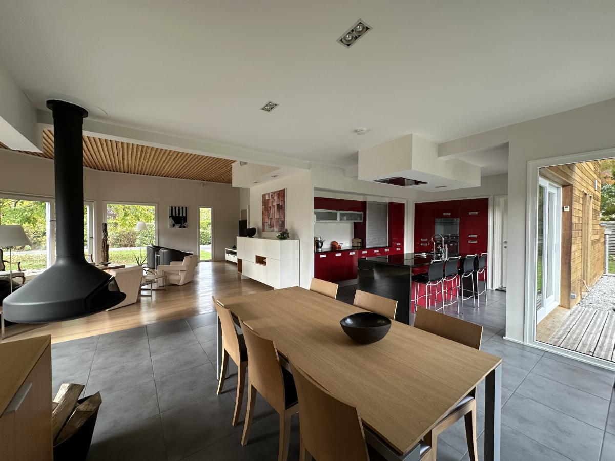 Construite en 2007, cette maison à ossature bois allie modernité et respect de l'environnement. Elle se compose d'un hall d'entrée, d'un vaste salon/séjour lumineux et chaleureux de 68 m² avec une cheminée feu de bois suspendue, une cuisine équipée ouverte, une suite parentale avec dressing et salle de douche, WC, buanderie et accès au garage. A l'étage, on retrouve un bureau et un espace de rangement, 3 belles chambres, une salle de bains et un WC. Vous trouverez également une grande terrasse en bois à l'étage.